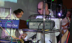 Heimstatt Yipotash brachten plötzlich ganz anderen Sound. Diesmal wurden eher Flächen und strukturierte Geräuschkulissen dargeboten. Für diesen Mut gibt es von mir ein riesiges Lob, denn die Konsequenz war, dass sich der Bereich vor der Bühne sehr stark lichtete. Normalerweise ist es genau umgekehrt. (Alles stürmt aus irgendwelchen versteckten Ecken, um der Tanzaufforderung zu folgen). Das letzte Stück wurde mit einem Geigensolo abgeschlossen, dass zugleich ein Geburtstagsständchen für den Musiker und Veranstalter